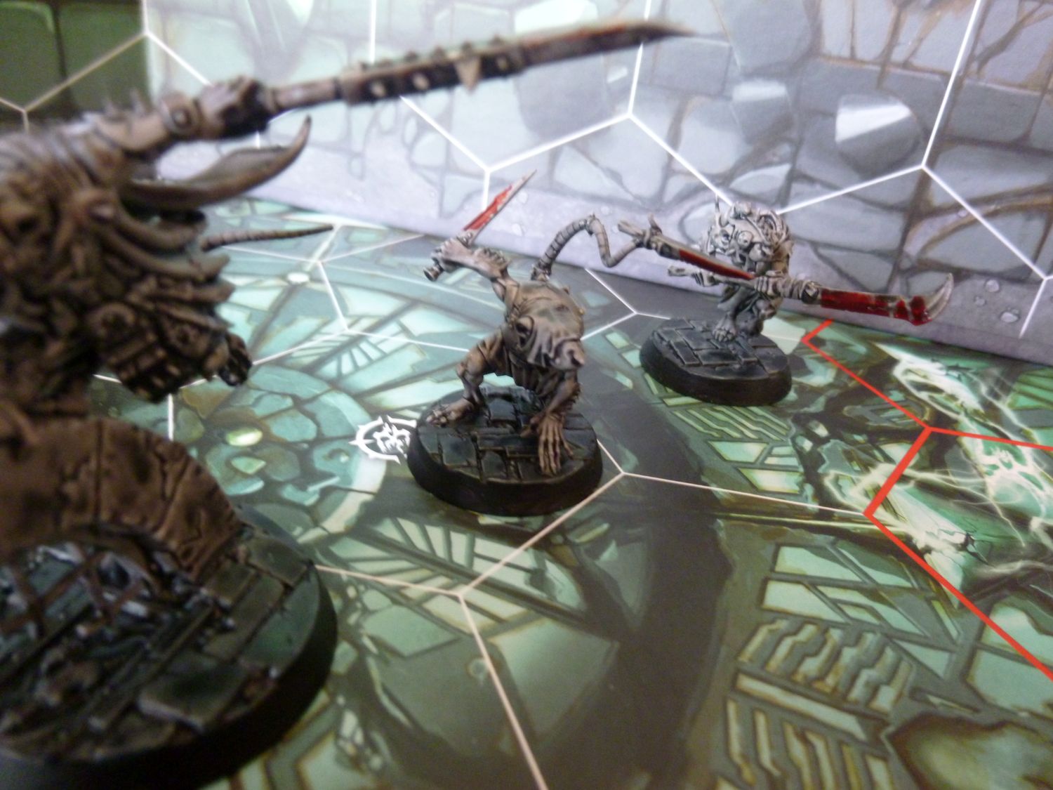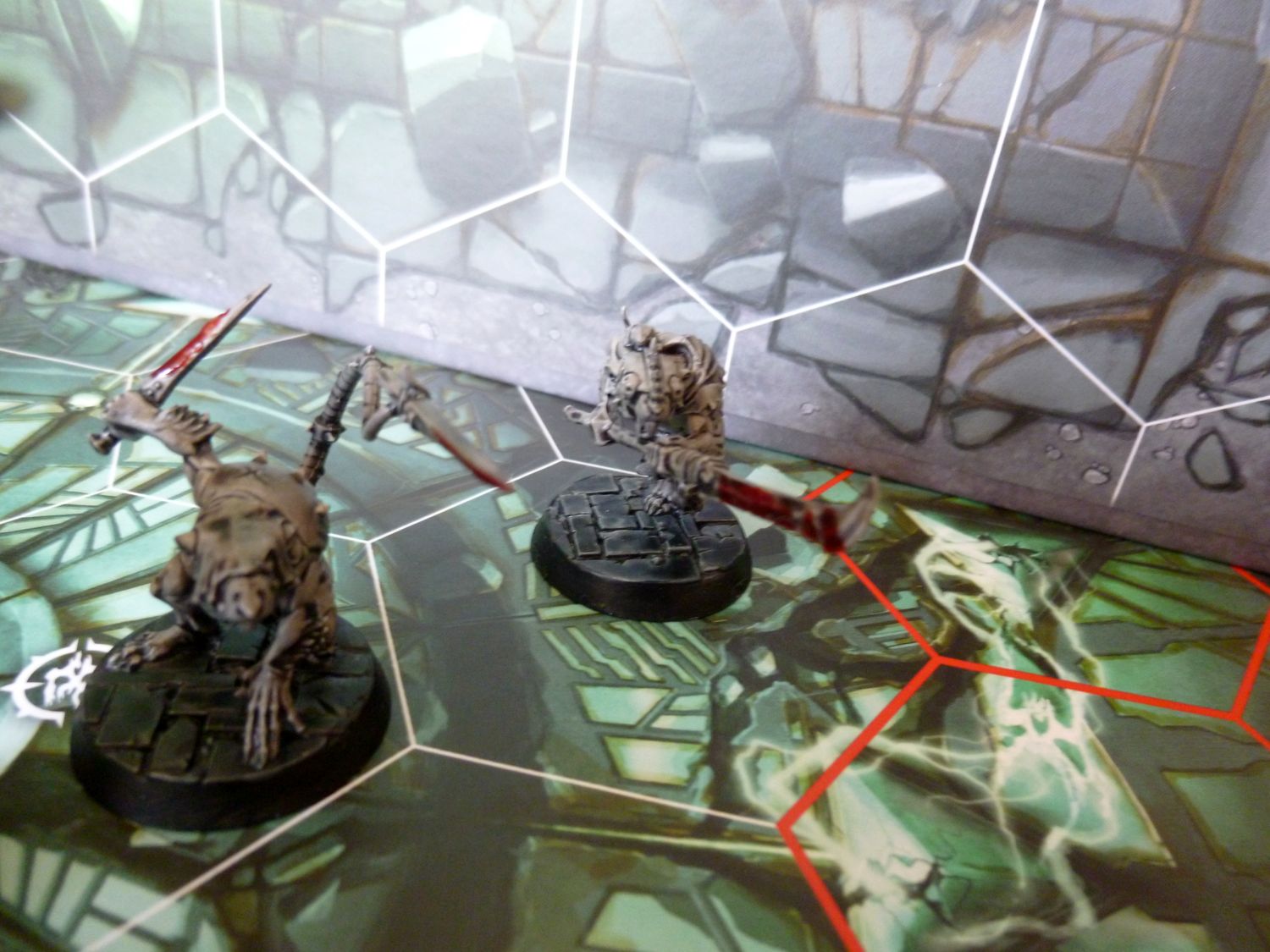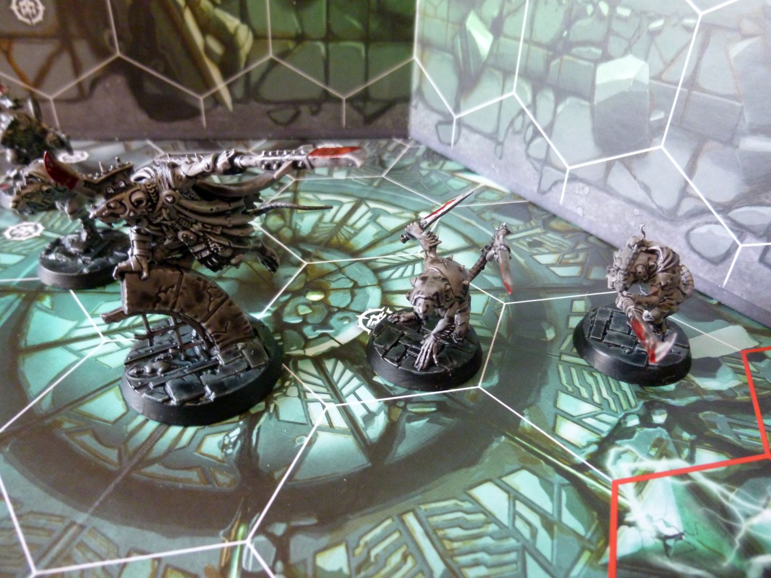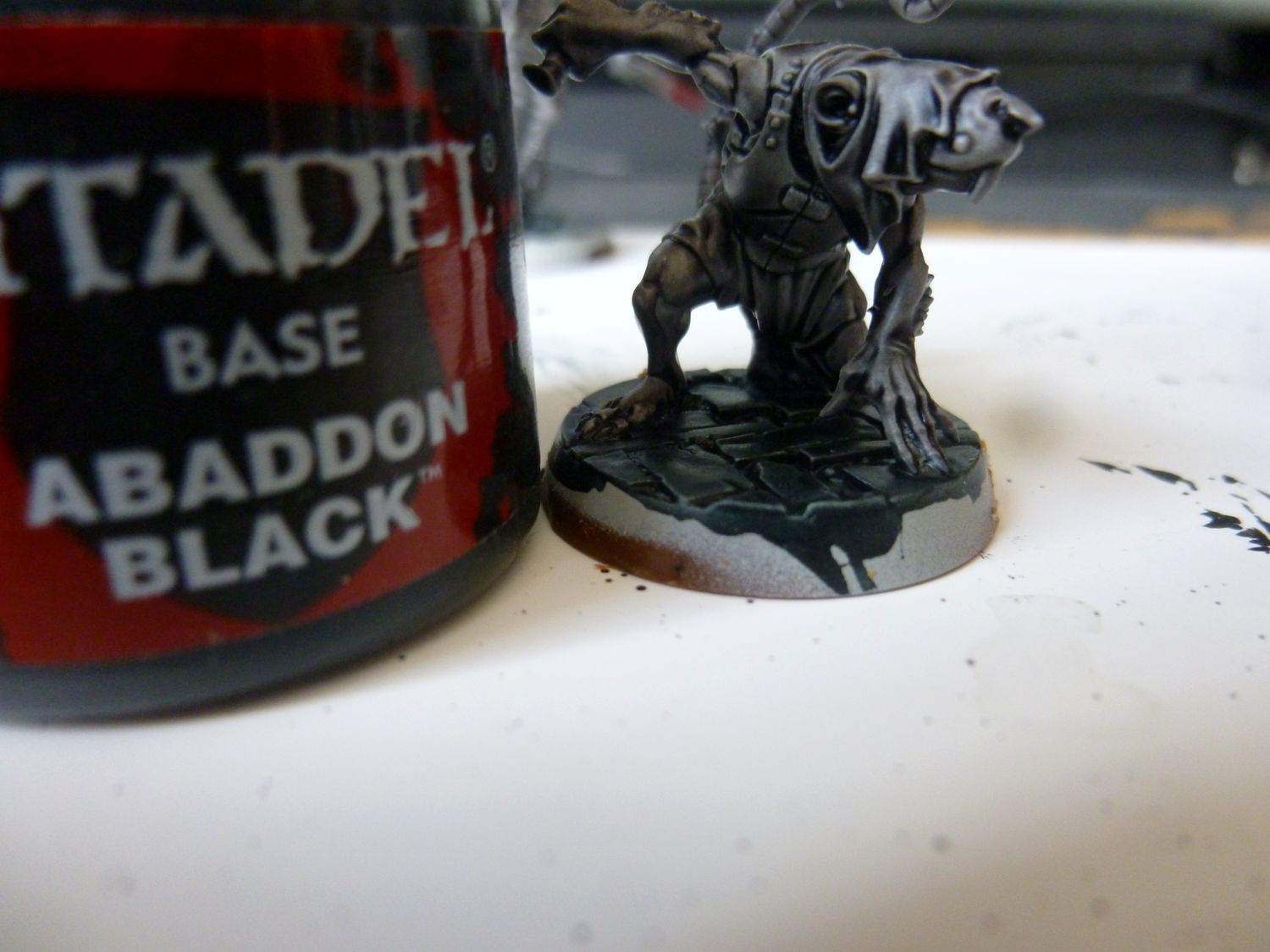 Je suis satisfait du résultat. Même si en regardant de prés, tout n’est pas top. Mais le rendu général est bon pour jouer je trouve. Petite remarque, ma figurine de test est légèrement mieux je trouve. Il est légèrement plus claire. Je pense que c’est parce que j’ai mis plus d’eau au départ dans ma contrast grise. Je referais un test avec mes goules en ajoutant un peu de médium à la contrast.