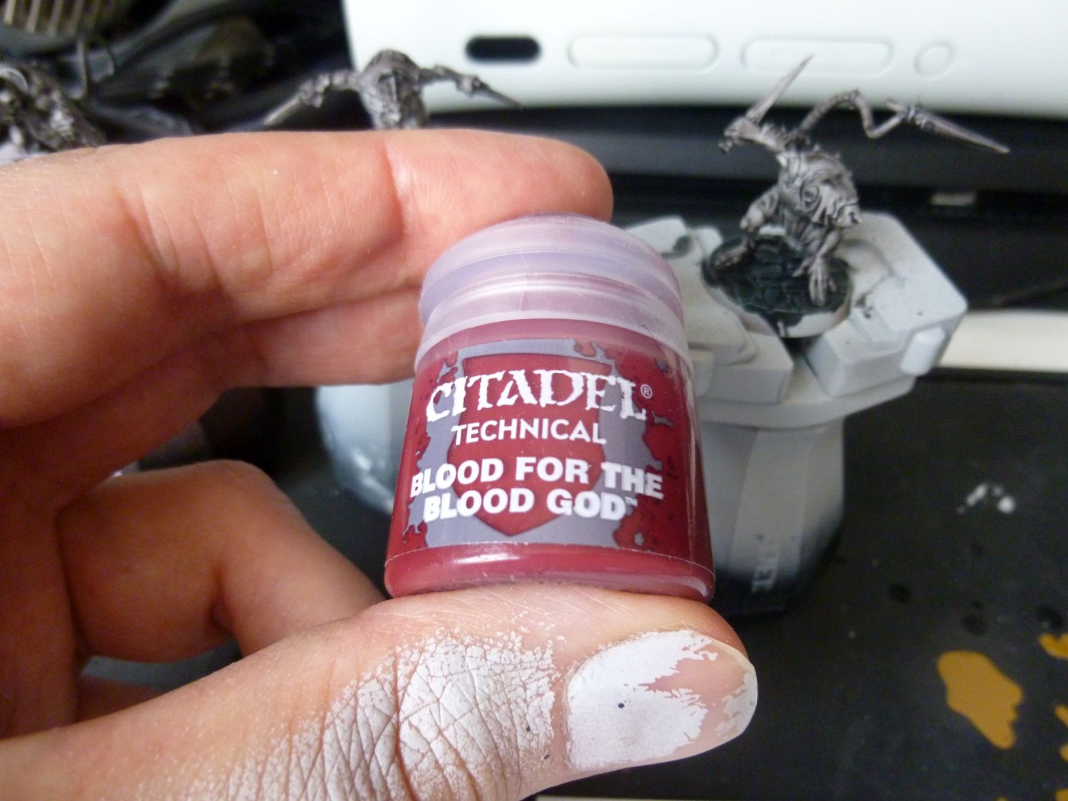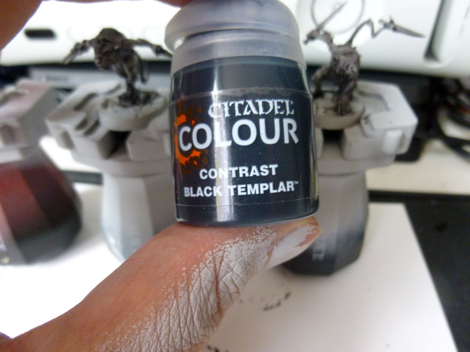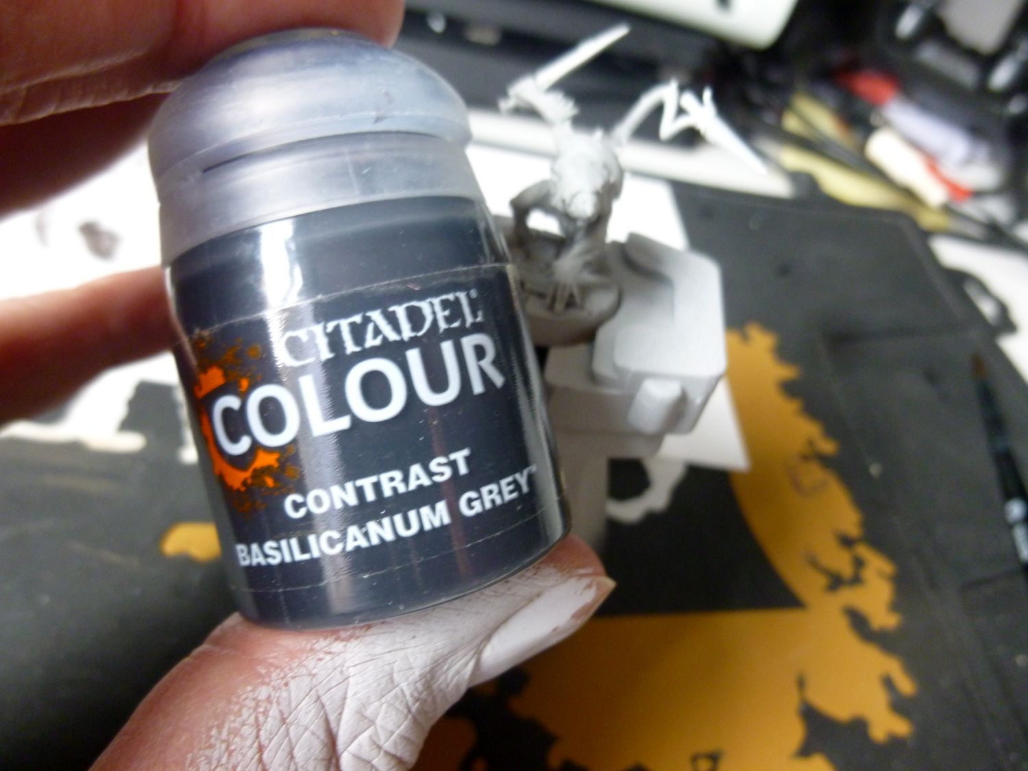 Une sous-couche de Grey Seer, une couche de Basilicanum Grey sur le personnage, une couche de Black templar sur le socle. Puis verni. Petite touche personnelle : un peu de Blood For The Blood God pour apporter une touche tonique ! Je le met après le vernis qui est mat alors que ce Blood est brillant .Ainsi, il ressort plus ! Et pour finir, le tour du socle en Abanddon Black.