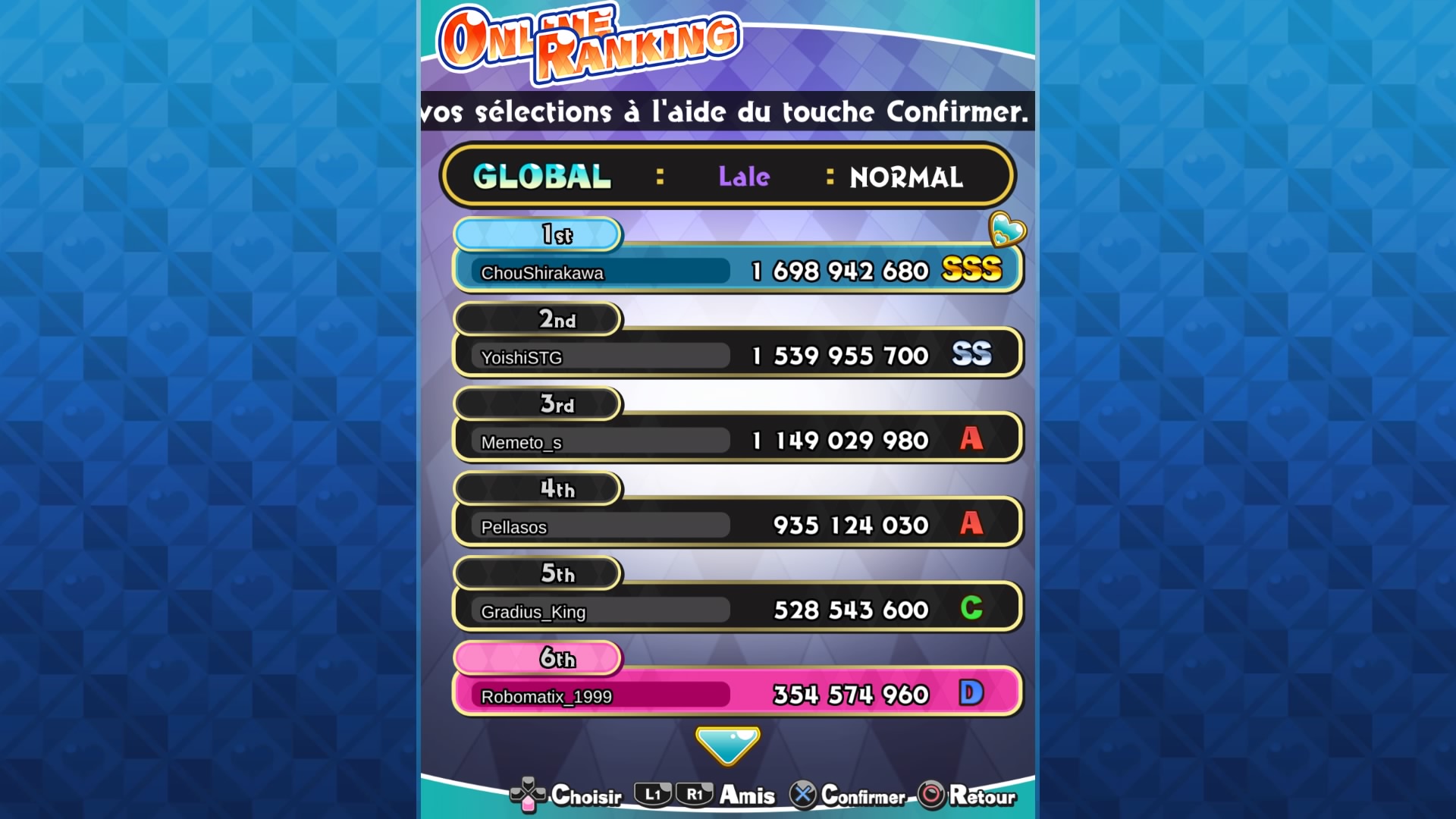 Je vous présente ici mon cheminement vers le fait d’être dans le Top 6 du mode Normal de Sisters Royale avec chacun des six personnages.