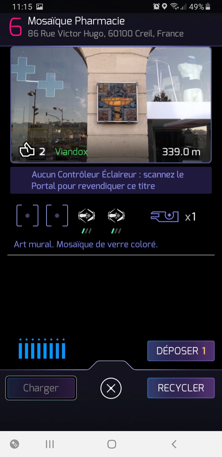 Peu avant le petit matin du samedi 20 novembre 2021, je suis passé au niveau 10 à Ingress. Et ce en prenant le portail « Mosaïque Pharmacie » à Creil. En fait, je suis parti en expédition pour reprendre des portails et créer des fields dans Creil pendant la nuit. A la fin, je n’étais plus qu’à quelques pixels du niveau 10. Je me suis donc décidé à allumer complètement des portails, juste pour marquer des points. Je fus aidé par le fait que tous les points étaient doublés pour fêter le neuvième anniversaire de Ingress Prime !!!! Et voilà !!!! C’est donc en allumant ce portail que je suis passé au niveau 10. Notez que j’ai pris la photo le lundi 22 novembre 2021. En effet, je n’y pas pensé sur le coup et en plus, il faisait noir de toute façon. On n’aurait pas pu admirer mon regard vif et mon poil luisant ainsi que le torse viril en plastique derriere moi !