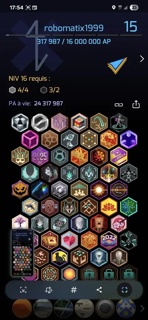 Comme vous pouvez le voir sur la capture d’écran ci-dessous, prise le mercredi 1 Octobre 2025, il me reste pas mal de point à gagner avant le niveau 16. Mais, j’ai toutes les médailles qu’il faut !!!!