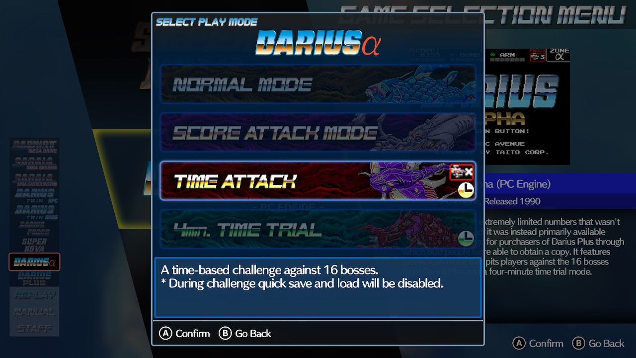 Les modes de jeux de Darius Alpha m’ont paru intéressant. C’est de l’endurance contre 16 bosses. Il y a le mode Normal qui permet de s’entraîner. Et le Score attack et le Time Attack avec leaderboard et replay possible. De ce fait, on peut s’entrainer dans le mode Normal et tenter d’atteindre des objectifs dans le le Sore Attack et le Time Attack. Le jeu est plaisant. L’ambiance bien rétro. Mais que je l’ai trouvé dur !!!! Je n’arrive pas à comprendre quand et pourquoi le boss fait telle ou telle chose. Je laisse tomber pour le moment. J’avais envisagé un moment d’en faire un défi et finalement, non. Mais j’y reviendrais plus tard, juste pour l’ambiance et tenter de battre mes scores pitoyables.