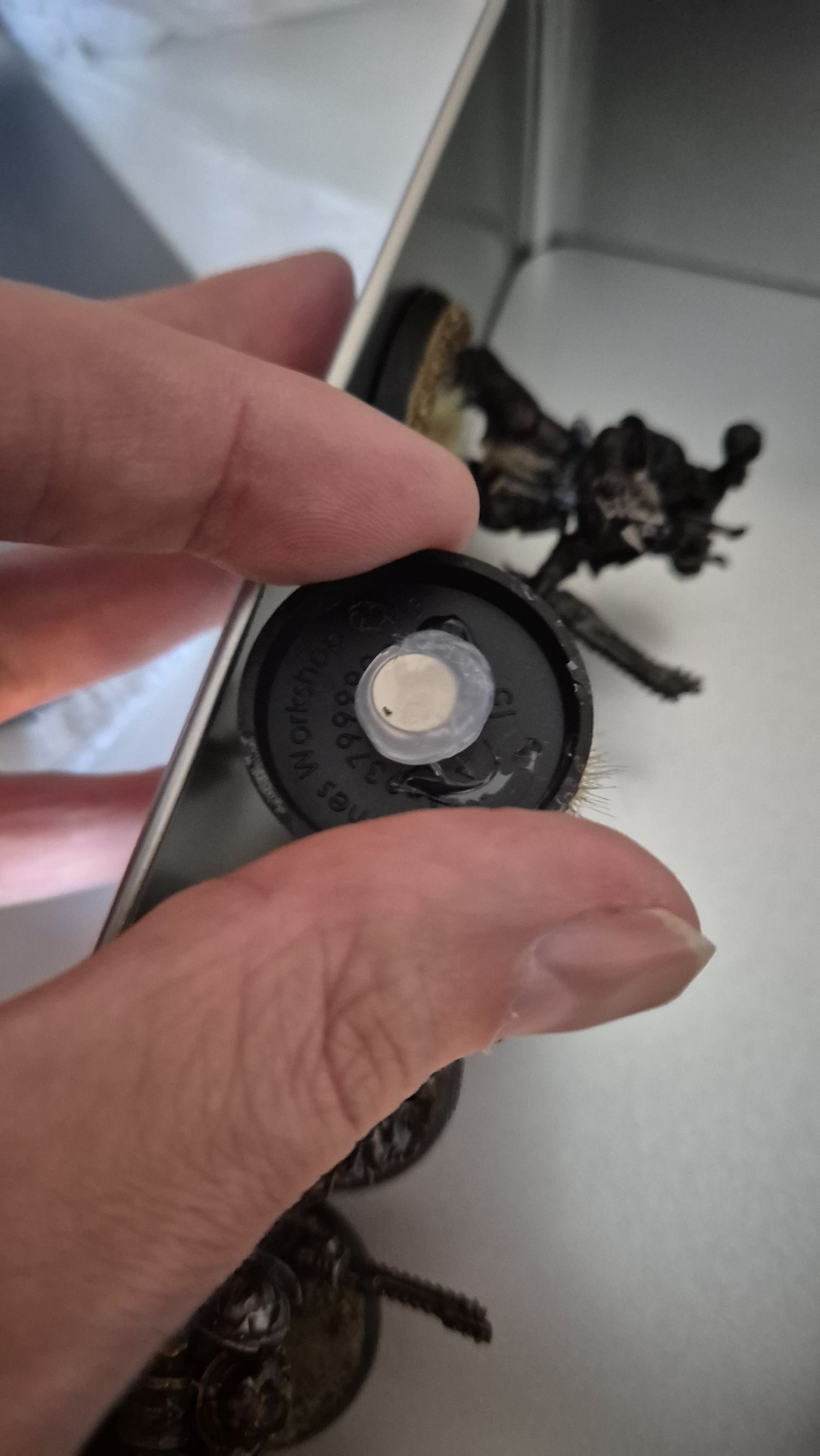 Je mis des aimants sur quelques figurines. Une grosse goutte de colle au fond du socle, placer l’aimant, un peu de colle par dessus. Puis mis à plat en mettant les figurine sur une plaque métallique. Ce fut difficile à retirer.