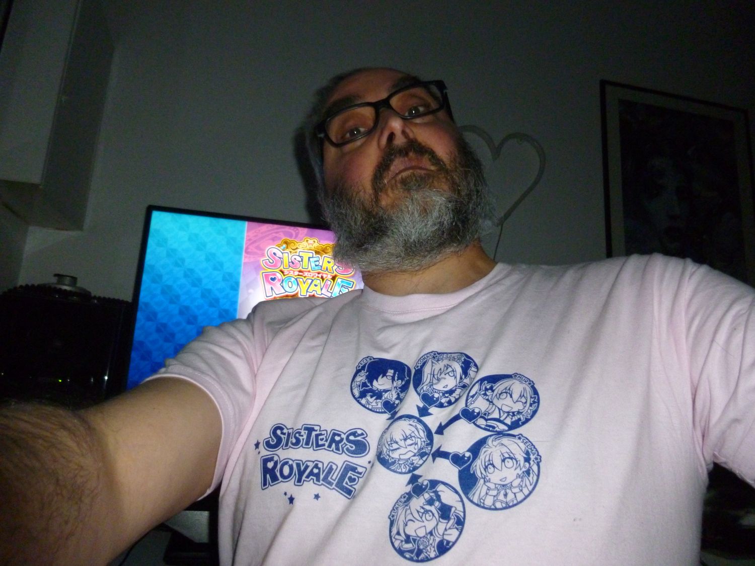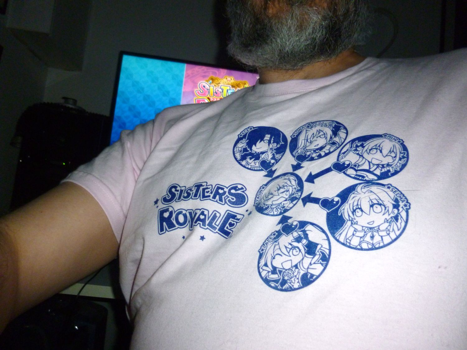 Et ce matin, avant le travail, j’ai essayer de jouer à Crimzon Clover pour le fun car je n’est pas osé jouer à Mushihimesam Black Label Original du fait de mon impossibilité à me concentrer sur un jeu en ce moment. En effet, mon travail me prend beaucoup d’énergie en ce moment. De plus j’aimerais sortir un nouveau morceau pour mon projet de Noisy Electro ONE HUMAN FACTOR. Et dans un cas comme cela, durant mon temps, je pense beaucoup à mon morceau. De ce fait, je n’arrive pas à me concentrer sur des jeux qui demande de la « ressource ». Donc, pour jouer en attendant que le soleil se lève, j’ai décidé de me remettre à Sisters Royale. C’est un jeu assez simple et bien fun ! Bon, je vous laisse avec un gros plan sur mon t-shirt tout beau tout neuf !!!!