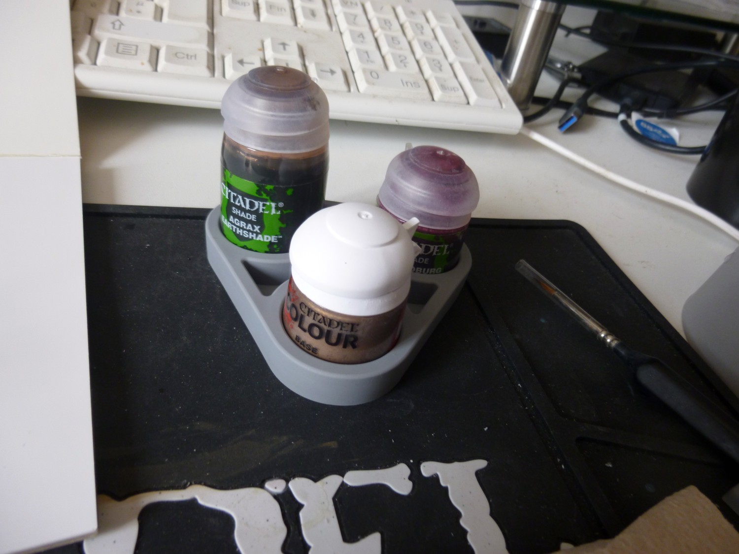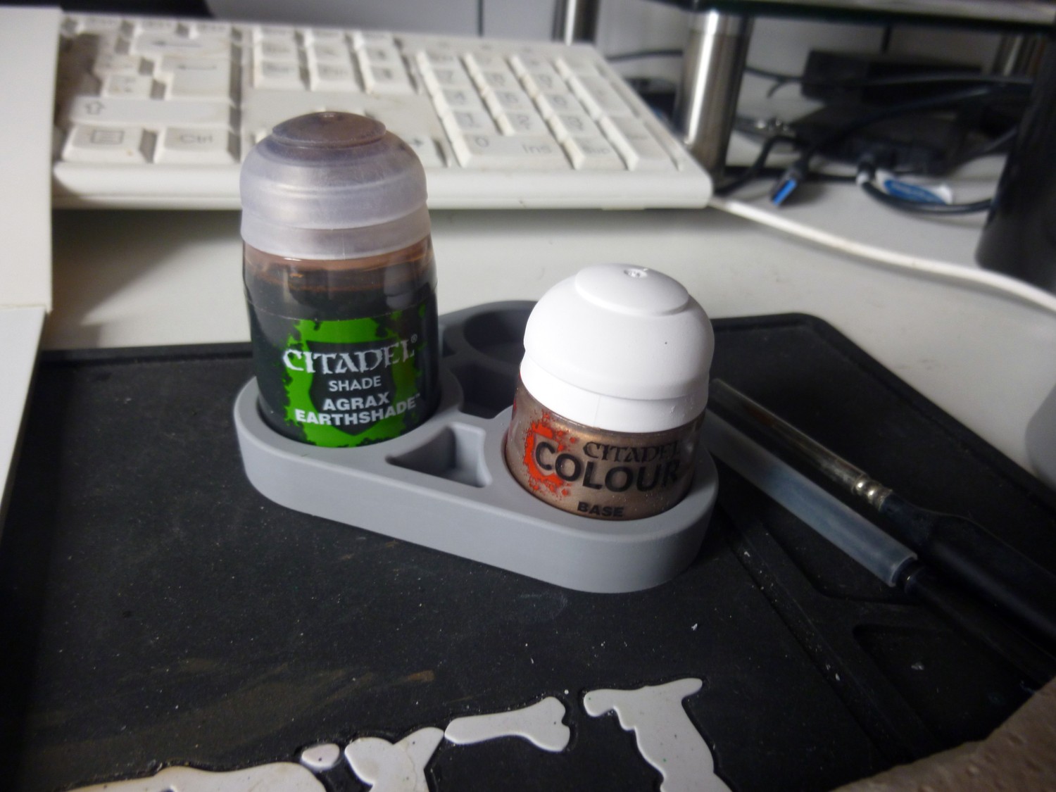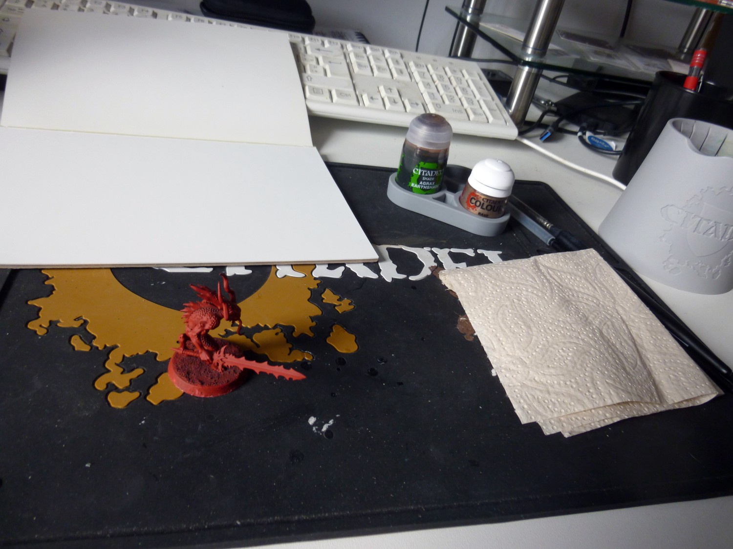A priori, je partirais bien sur une sous Mephiston avec de l’Agrax Earthshade. Et comme je le disais, je pourrais passer une seules couche de lavis sur toute la fig en une seule fois. En effet, le Runelord Brass pour les parties métalliques passe bien et ça devrait le faire sur du Wraithbone pour les griffes. A moins que je les fasse en noir.