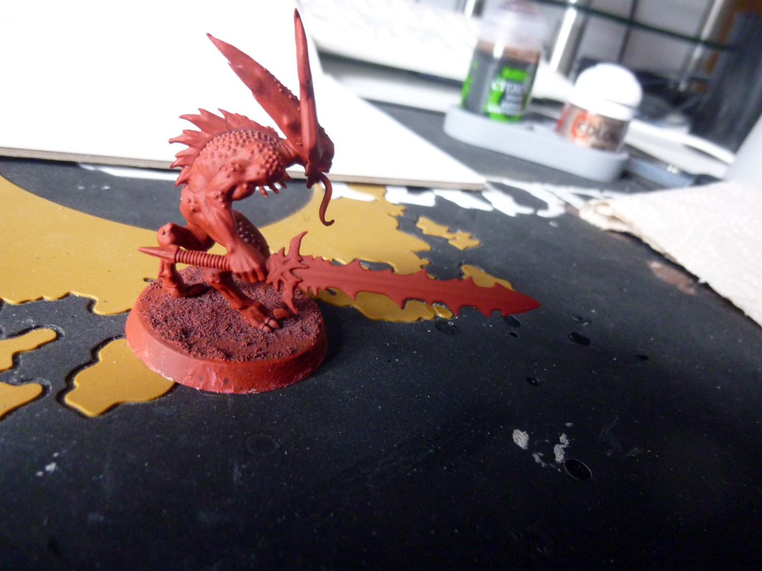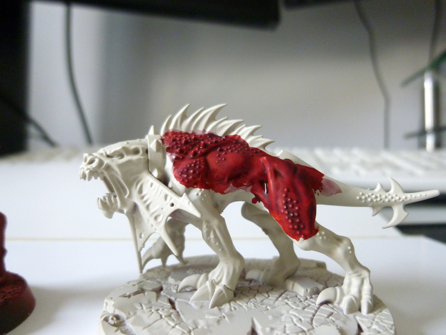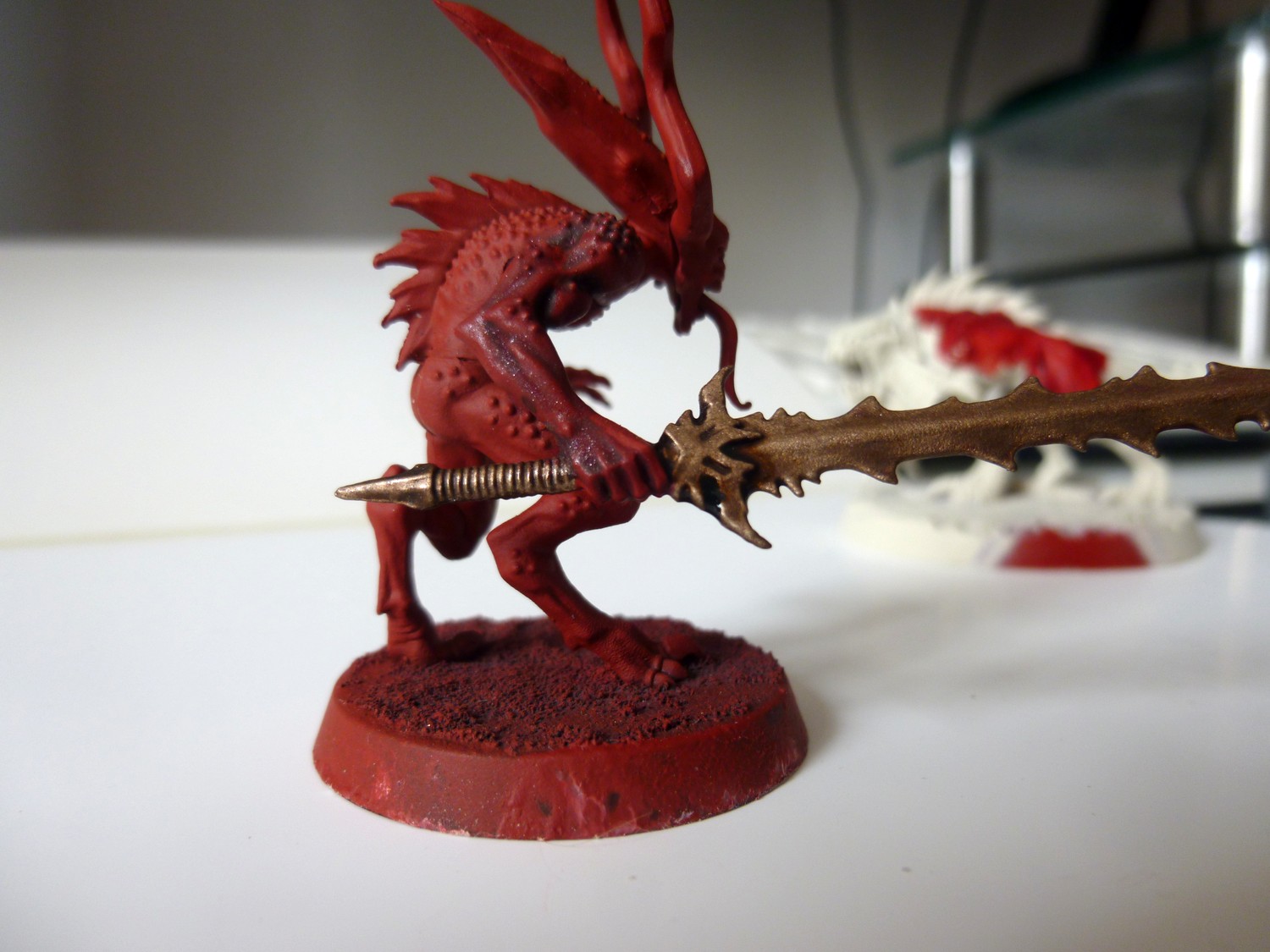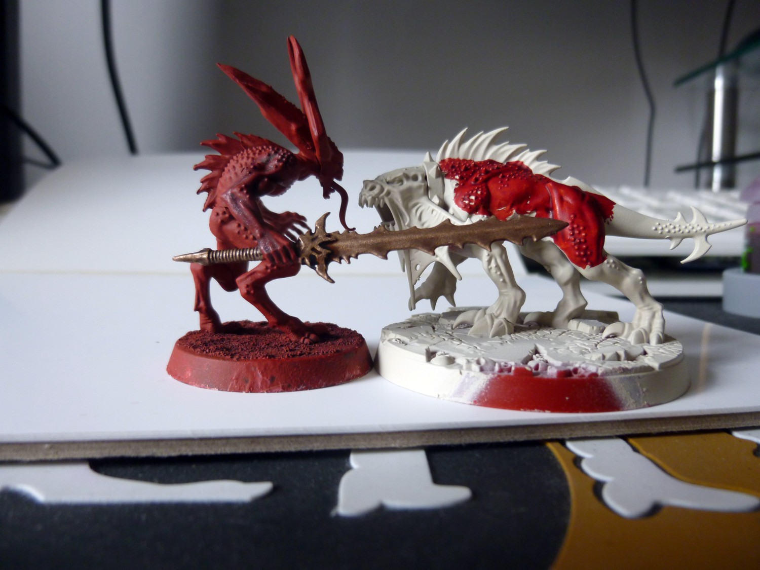 J’en ai profité pour faire des essais pour la peau de mes démons de Khorne. Le premier test fut sur une partie d’un figurine sous-couchée en rouge Mephiston et le second sur une sous-couche Wraithbone.
