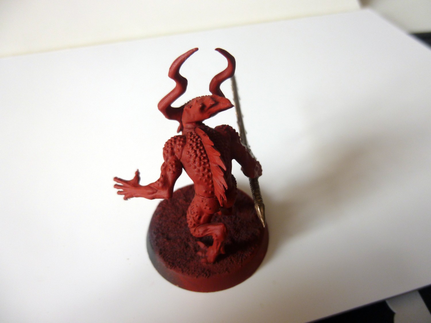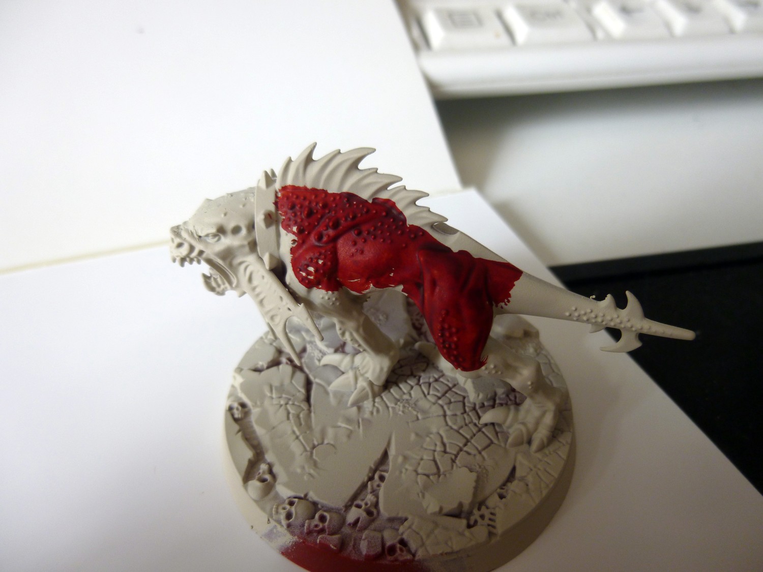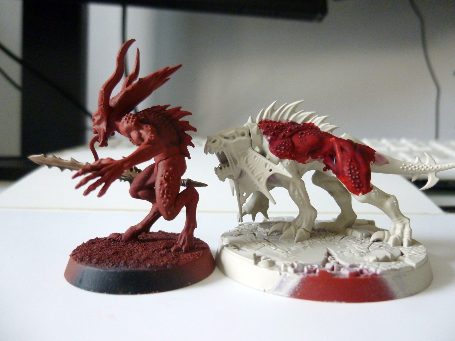 J’en ai profité pour faire des essais pour la peau de mes démons de Khorne. Le premier test fut sur une partie d’un figurine sous-couchée en rouge Mephiston et le second sur une sous-couche Wraithbone.