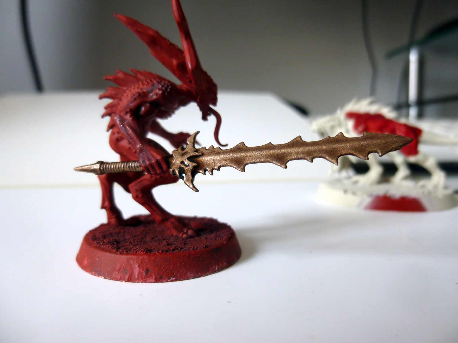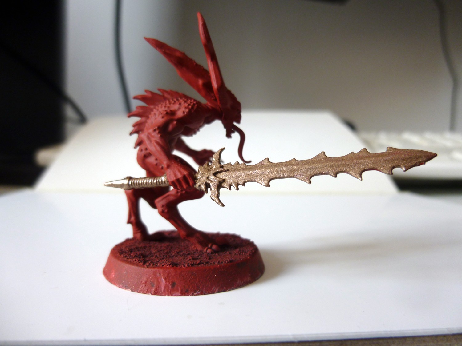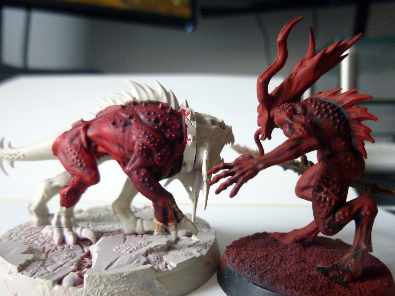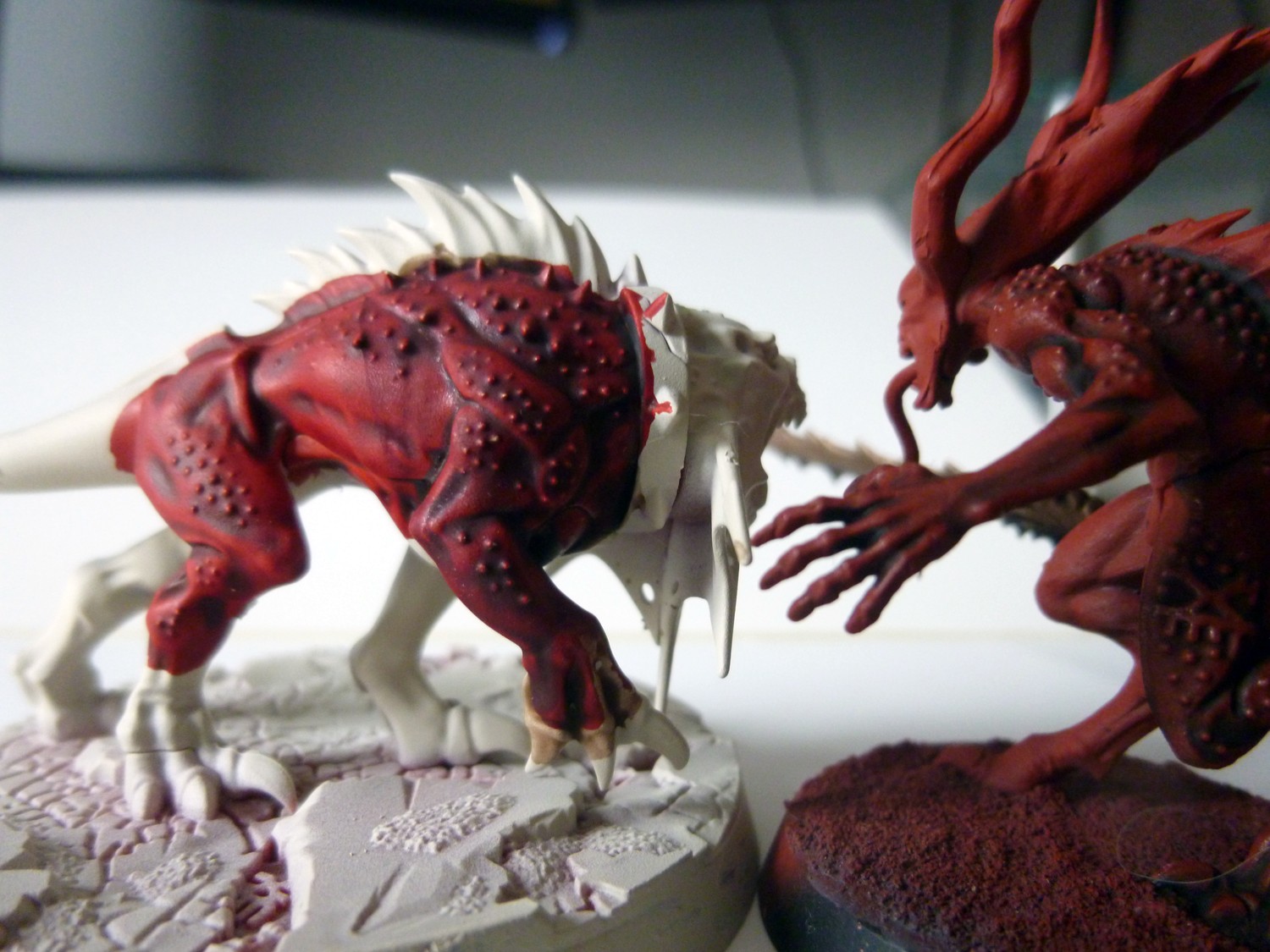 J’en ai profité pour faire des essais pour la peau de mes démons de Khorne. Le premier test fut sur une partie d’un figurine sous-couchée en rouge Mephiston et le second sur une sous-couche Wraithbone.