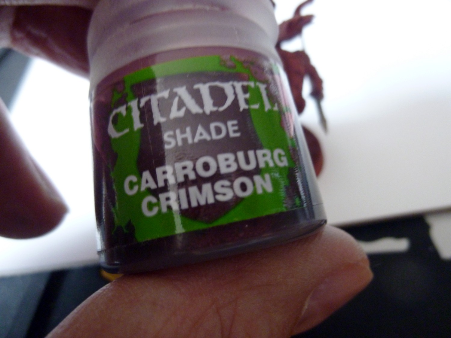 Sur la sous-couche Mephiston, j’ai appliqué un lavis Carroburg Crimson. Le résultat fut satisfaisant. Un rouge profond, peut être un peu trop sombre…