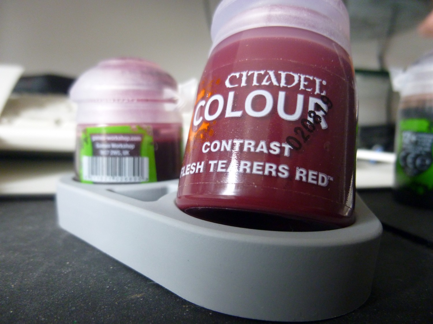 Sur la sous-couche Wraithbone, j’ai appliqué un contrast Flesh Tearers Red. Puis sur une partie, de l’Agrax Earthshade. La couche de Flesh Tearers Red rens mieux que celle d’hier je trouve. Peut parce que moins diluée, je ne sais pas. Puis sur la moitié, j’ai mis de l’Agrax Earthshade.
